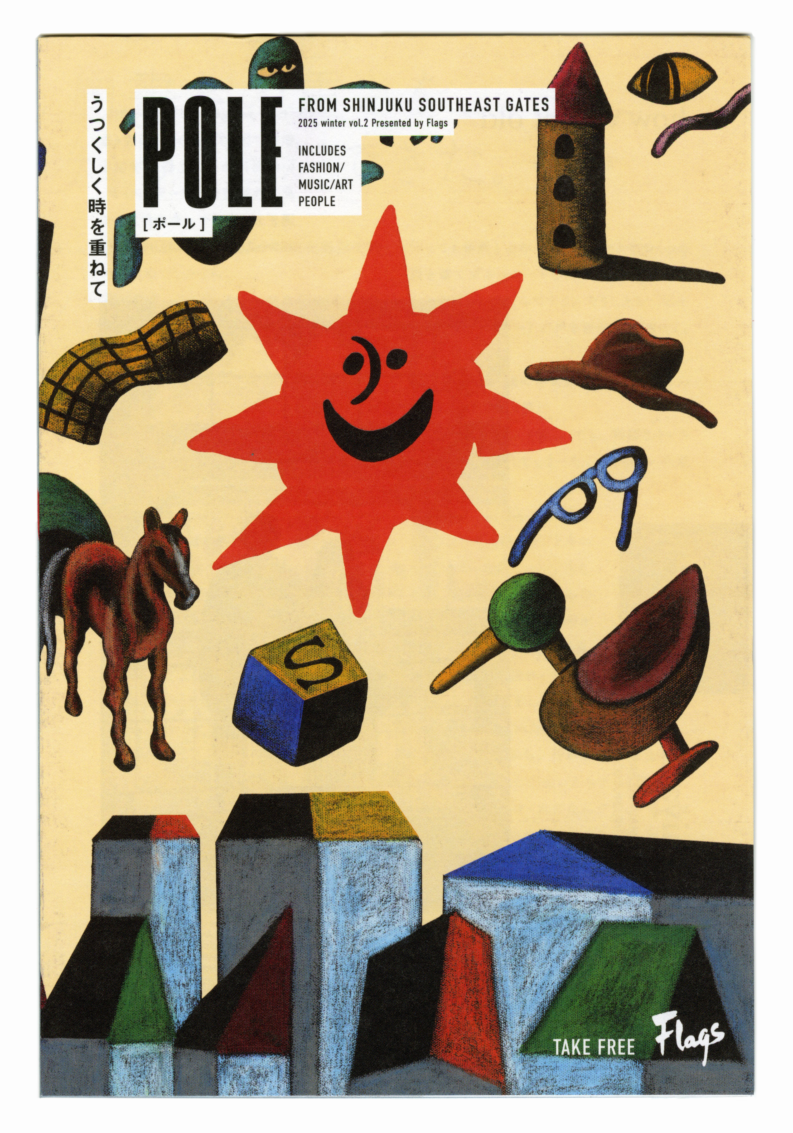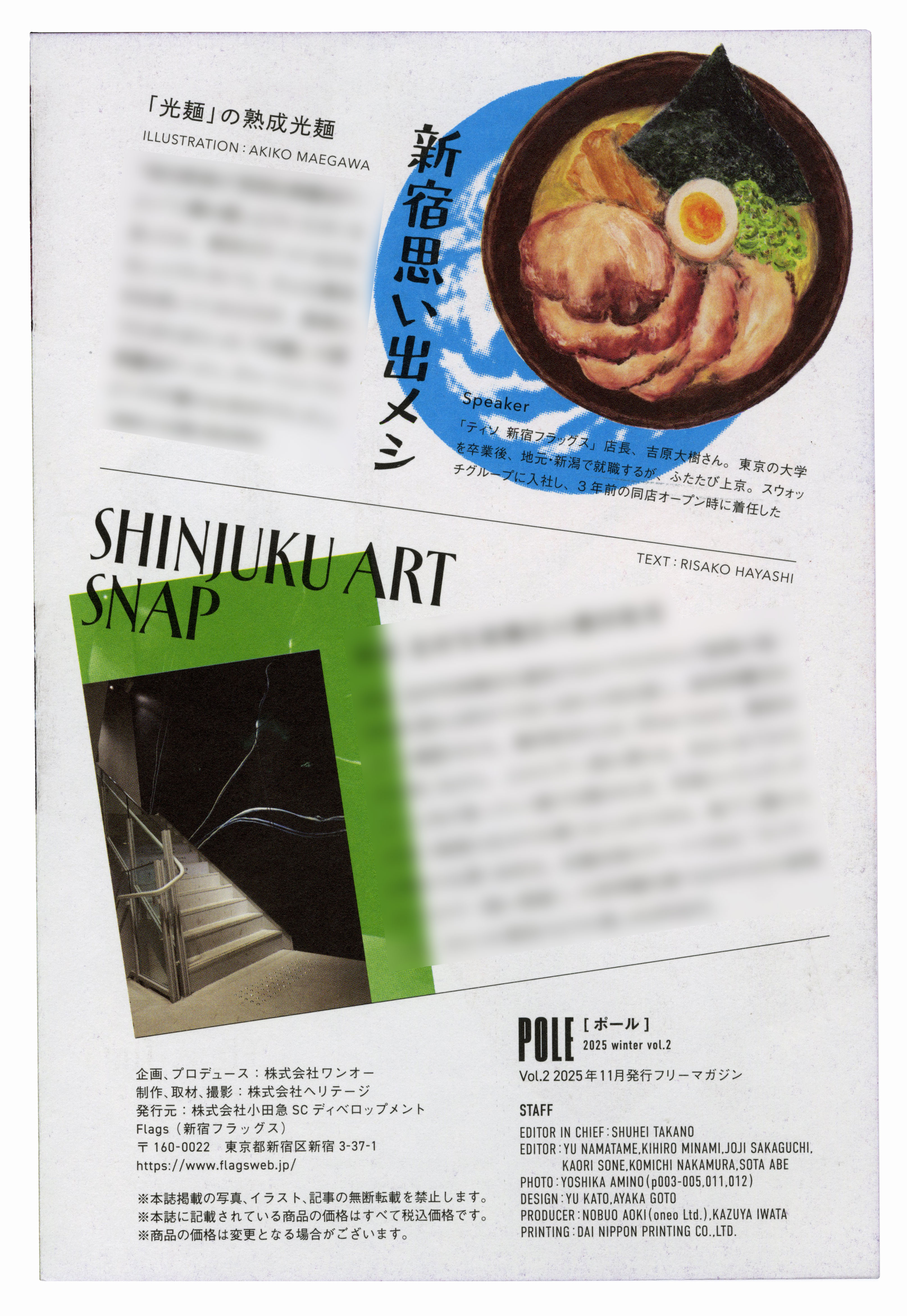 JR新宿駅の東南口にある商業施設Flagsが発行する新宿カルチャーマガジン「POLE」の中面にて「新宿思い出メシ」のコーナーで、「ティゾ 新宿フラッグス」店長の吉原大樹さんの忘れられない思い出の一品として、「熟成光麺」の絵を描いています。