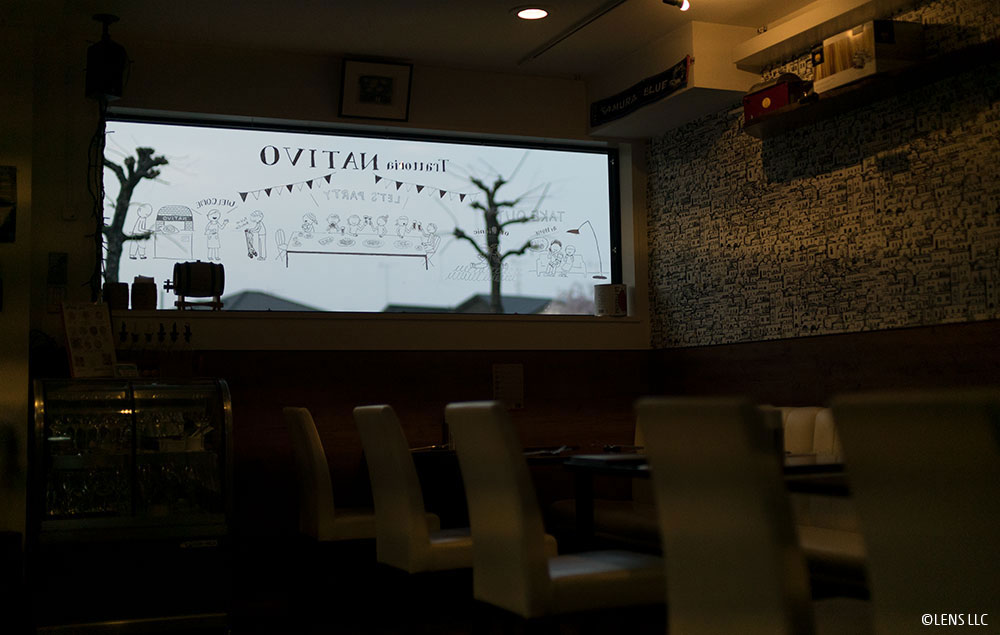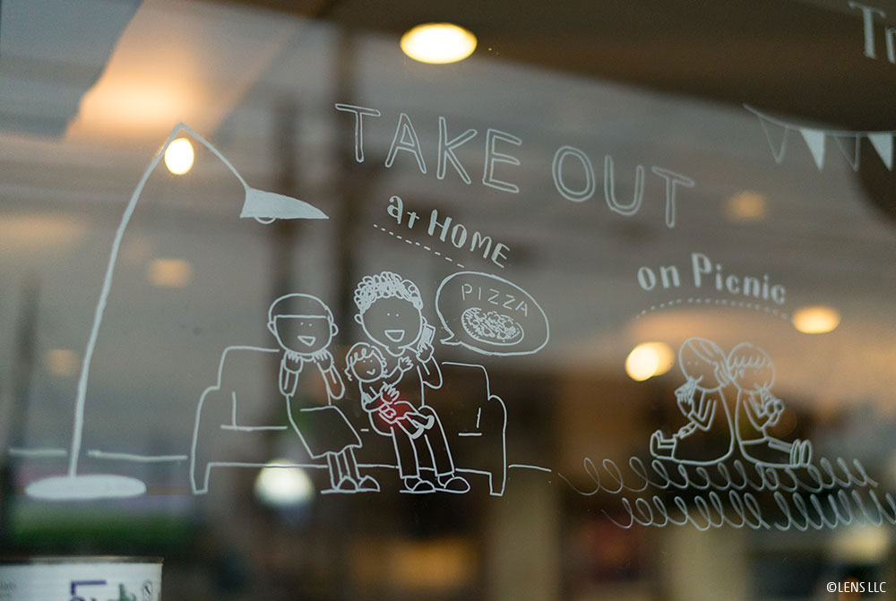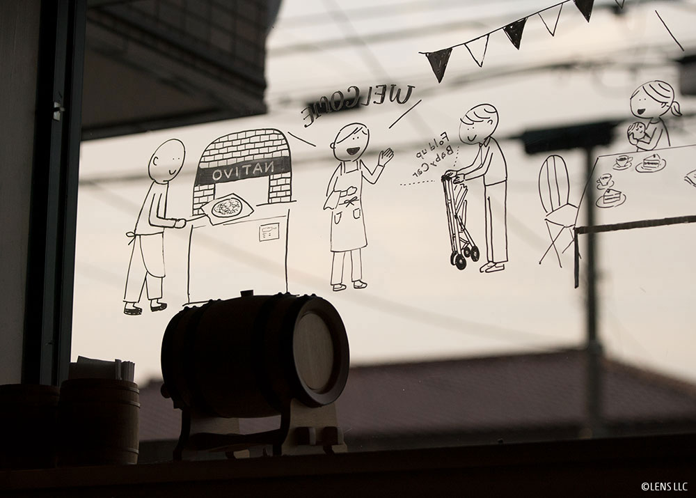 初めての窓ガラスへのイラストレーションということで緊張しました。ガラスに光が反射し、撮影がとても難しかったのでLENSの二人にお願いしました。さすがの仕上がりです!きれいに撮ってもらって感激しています!