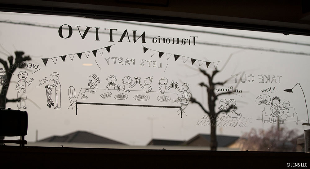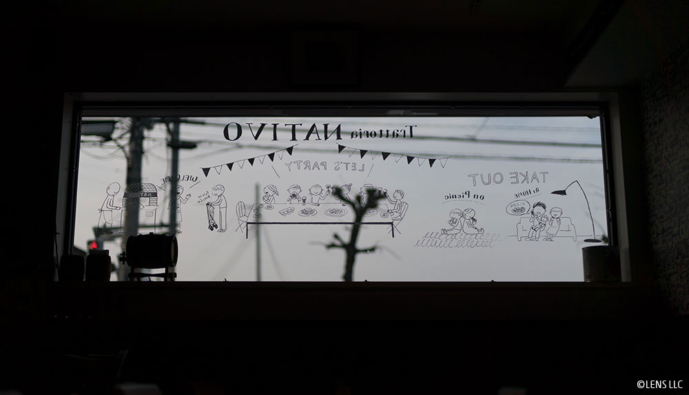 親しくさせていただいている東京・平和台にあるトラットリア・ナティーボさんのお店の窓ガラスにイラストを描かせていただきました。こちらのピザは絶品です!